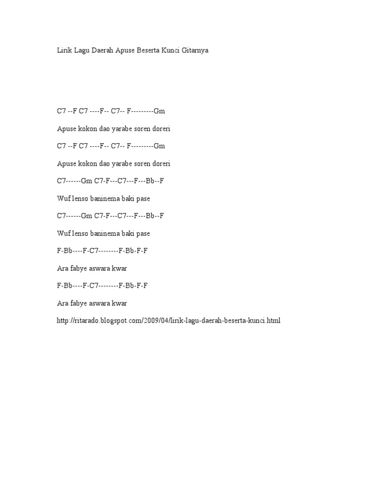 Lagu apuse ini menceritakan tentang seorang cucu yang berpamitan kepada kakek dan neneknya. Apuse kokon dao yarabe soren doreri wuf lenso bani nema baki pase apuse kokon baca selanjutnya lirik sajojo lirik yamko rambe yamko lirik apuse lirik lagu papua lirik aku papua skip to content. Kunci gitar lagu daerah apuse papua.