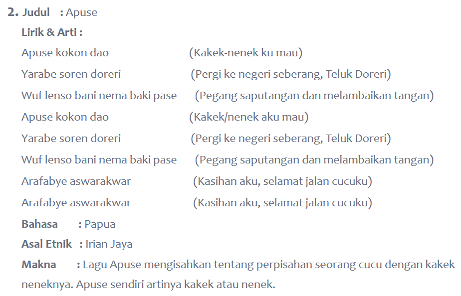 Lagu lagu daerah nusantara dari papua tersebut walaupun dalam bahasa papua namun sangat di kenal luas. Not angka dan lirik lagu apuse merupakan lagu daerah yang berasal dari papua saya rasa semua sudah tahu deh. Apuse kokon dao yarabe soren doreri wuf lenso bani nema baki pase arafabye aswarakwar arafabye aswarakwar.